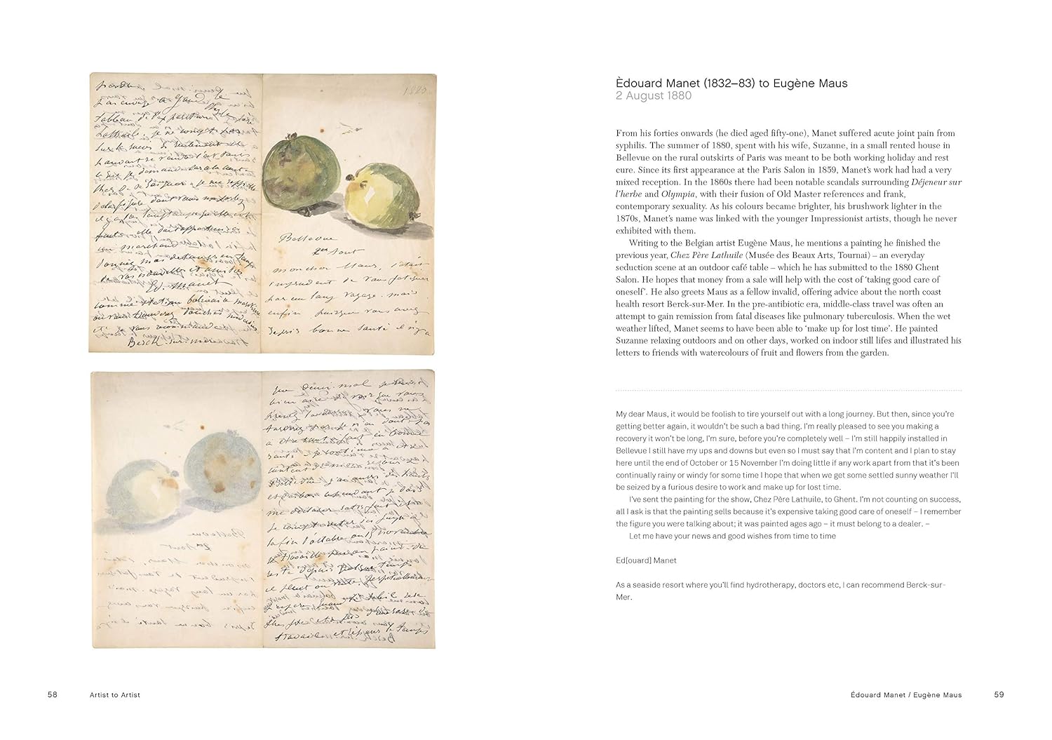 On the theme of friendship, for example, letters provide evidence of a creative community between peers, with support and mutual appreciation that helps to dispel the myth of the artist as solitary genius. Letters between Vincent van Gogh and Paul Gauguin show an ongoing conversation and exchange of ideas. We see mutual admiration between Claude Monet and Berthe Morisot, and Picasso’s quick notes to Jean Cocteau illustrate their closeness. Letters, some of which includes sketches and drawings, are reproduced with the transcript and some background and contextual information alongside.