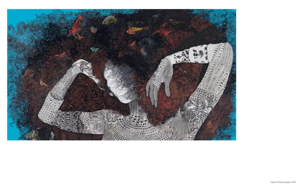 Over the last 15 years, Firelei Báez has created artwork that delves into the historical narratives of the Atlantic Basin. She draws on the disciplines of anthropology, geography, folklore, fantasy, science fiction and social history to unsettle categories of race, gender and nationality in her paintings, drawings and installations. Her exuberant paintings feature finely wrought, complex and layered uses of pattern, motifs and saturated hues. Primarily centering women of color, her works incorporate regal fashion styles and decorative elements as well as defiant gazes in order to assert their authority.