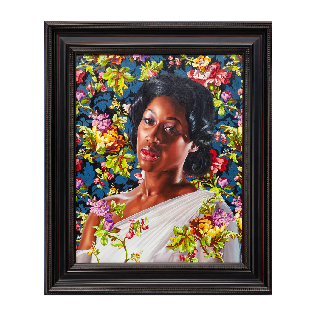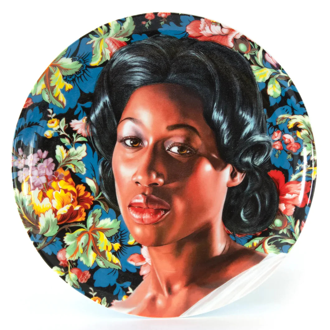 Kehinde Wiley's collection of six porcelain coupe plates allow you to bring the contemporary art home. Made in direct collaboration with the artist, the collection features details from paintings spanning 2008-2012. Each of the six images - 3 male and 3 female - are cropped against intricate, vibrant backgrounds, and can be hung decoratively or used as completely functional dinner plates. This porcelain plate features a detail from Kehinde Wiley’s 2012 painting Mrs. Graham, reimagined from Thomas Gainsborough's The Honourable Mrs. Graham (1777). Originally exhibited at Sean Kelly Gallery in An Economy of Grace, Wiley’s model was cast from the streets of New York City. Each coupe plate is 10.75" and shows a stamped signature on the verso. The plates are individually boxed.